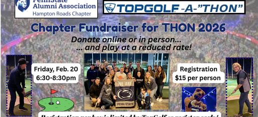 Join us at PSU Hampton Roads for a variety of engaging events and activities! From exciting football watch parties and community service projects to staffing college fairs and hosting our annual Spring Fling and Silent Auction, we offer something for every Penn Stater. Connect with other alumni at our alumni gatherings, cheer on PSU teams when they play locally, and join us for the annual Top Golf-a-Thon. Our events also include student-focused initiatives, like the Sendoff Picnic and scholarship fundraisers, all geared toward building a strong local Penn State community.
